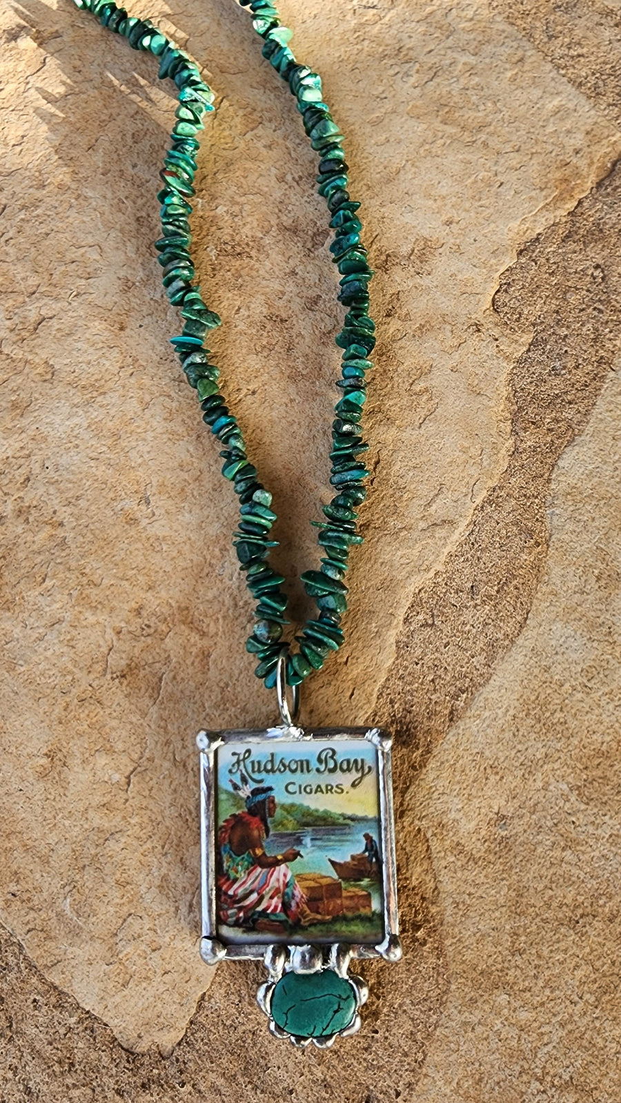 This beautiful Hudson Bay pendant is on a hand strung Howlite Turquoise necklace and measures 21" long.