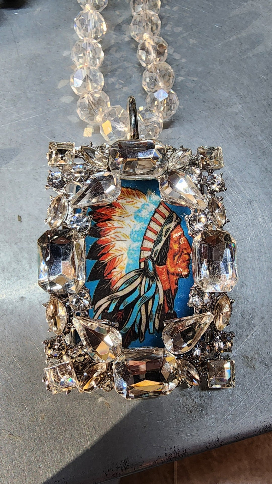 This beautiful Indian picture frame pendant comes on a 21" crystal necklace.