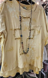 The distressed tee from Jaded Gypsy features a cut out cross and bleached/tie dyed fabric.