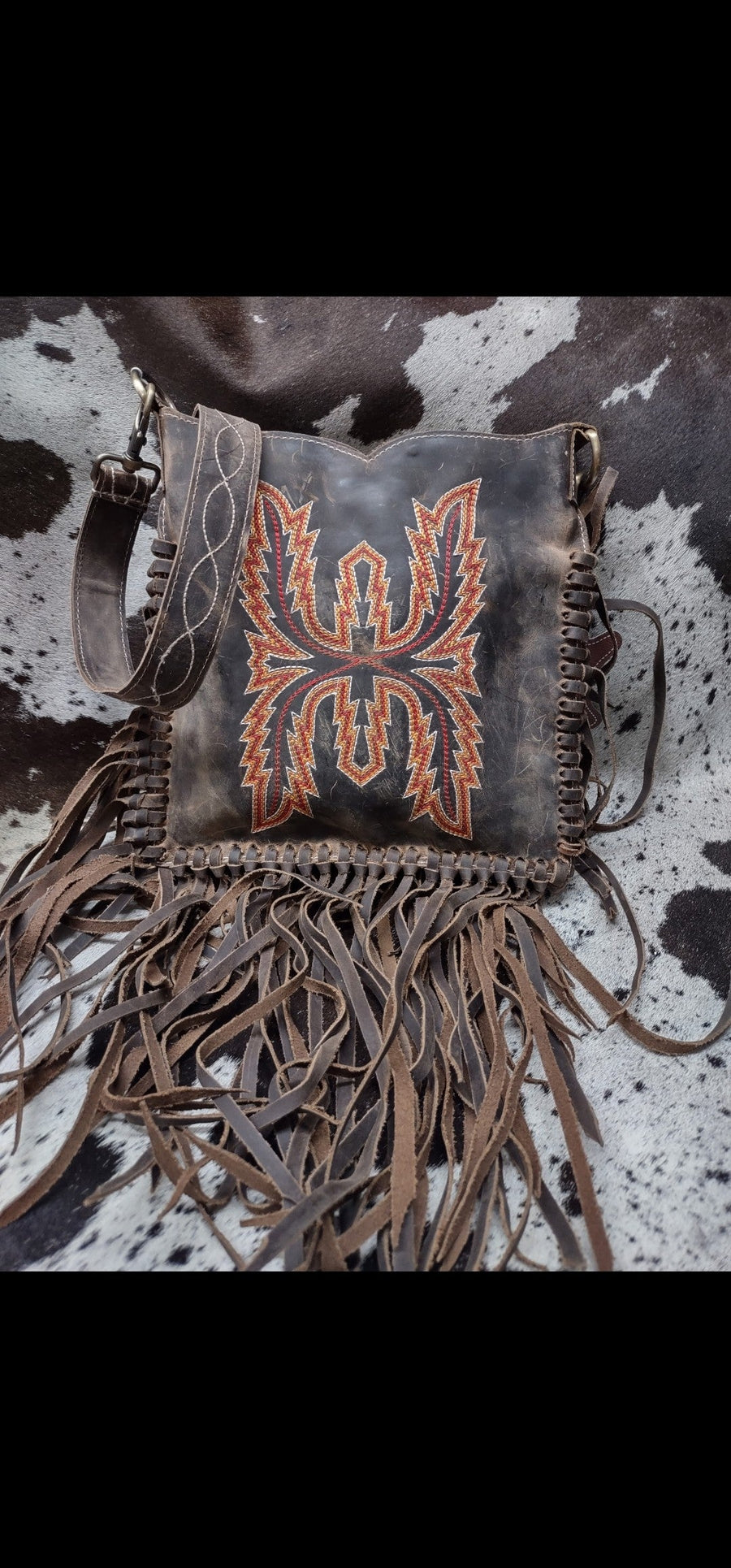 This colorful leather crossbody purse measures 10.5"x10.5"
