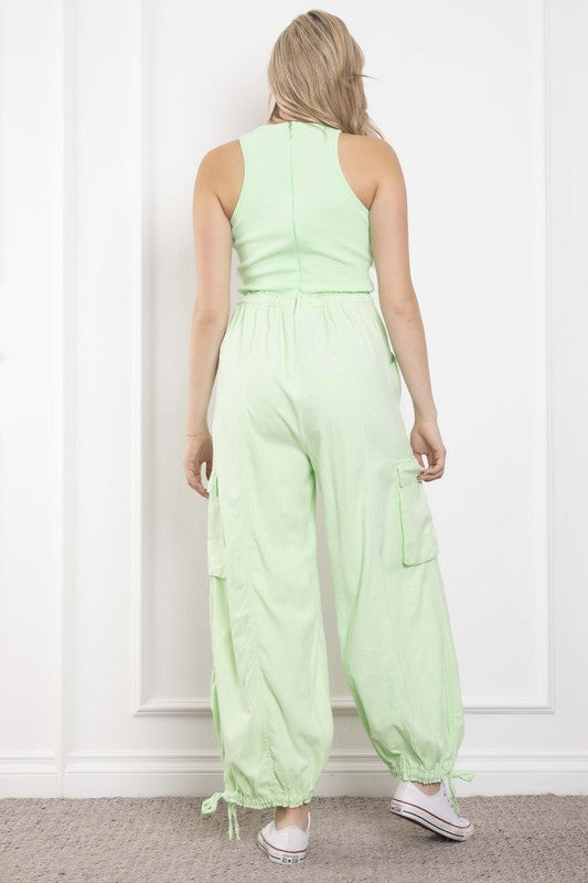 Elevate your casual wardrobe with this refreshing light green jumpsuit! Crafted for comfort and style, this one-piece wonder features a sleek high-neck fitted top that beautifully complements the relaxed, wide-leg cargo pants. With its adjustable drawstring waist and ankle ties, you can easily customize the fit for a chic, laid-back look. The convenient side pockets and functional cargo pockets add a playful, utilitarian touch. Perfectly paired with sneakers for a day out or dressed up with sandals for a brunch date, this jumpsuit is the ultimate blend of fashion and functionality. Get ready to turn heads in this effortlessly stylish piece!