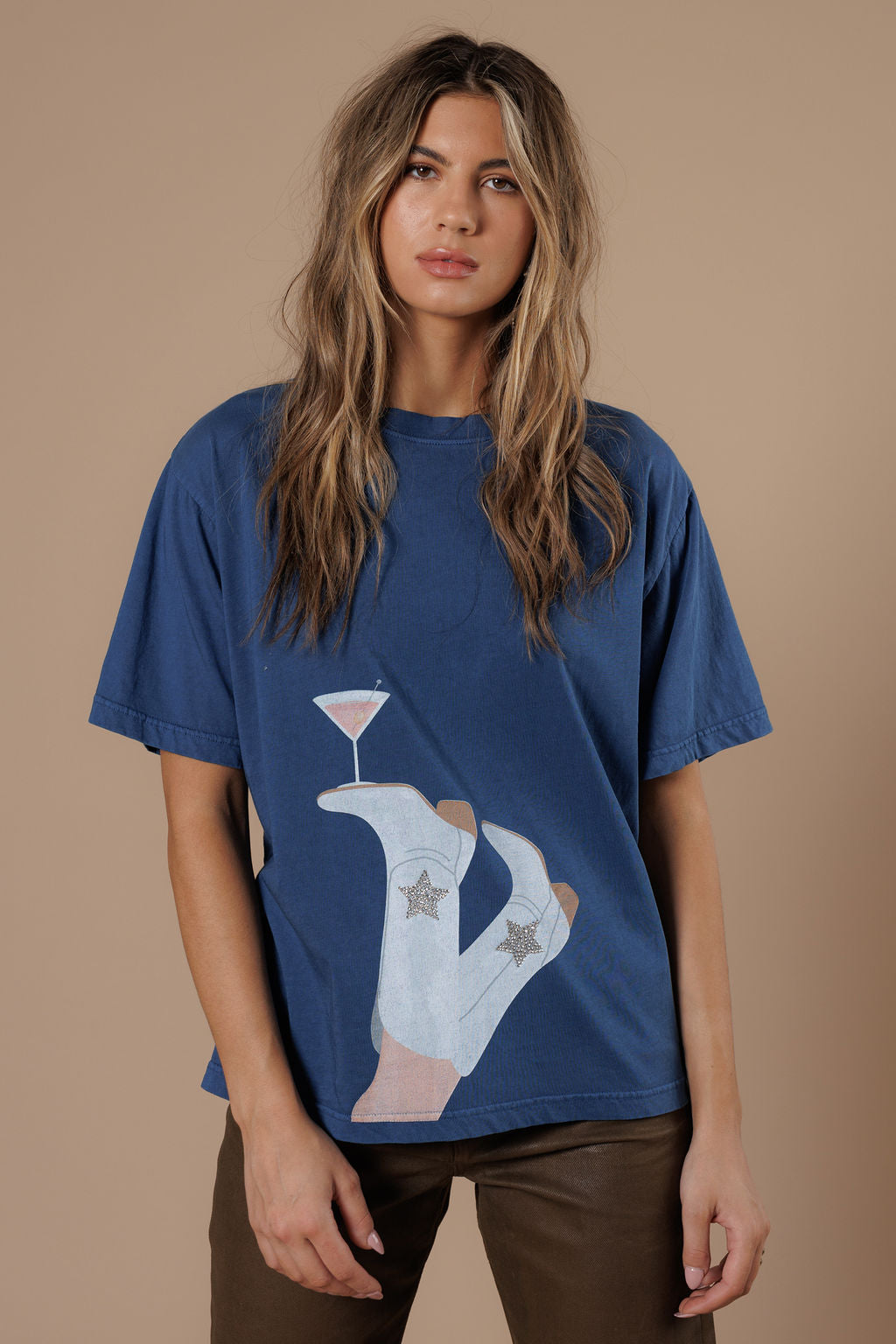 This navy tee features a bold graphic of boots accented with a star, cleverly balancing a drink. Perfect for a casual, rugged look with a playful twist.