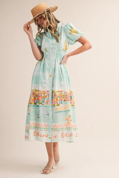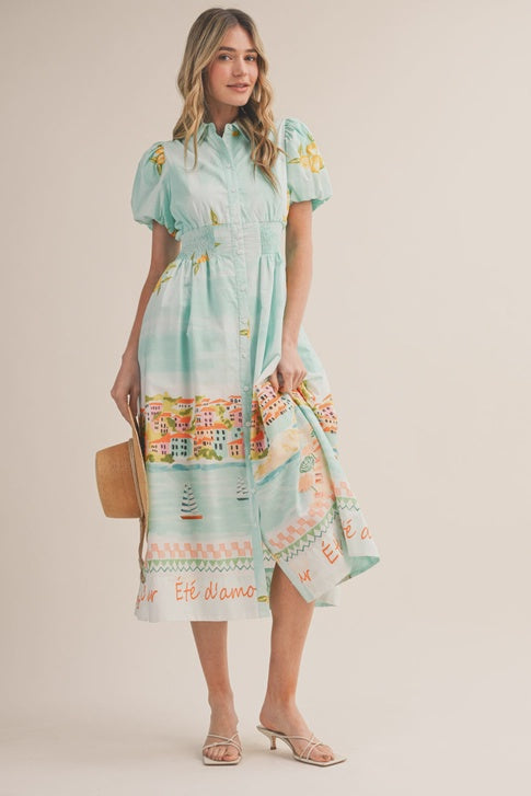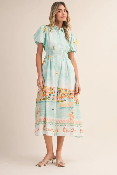 D'Amour Button Down Dress in a stunning landscape print. Classic button-down silhouette with a modern artistic twist. Perfect for casual outings or dressed up for any occasion. Comfortable fit that transitions seamlessly from day to night.