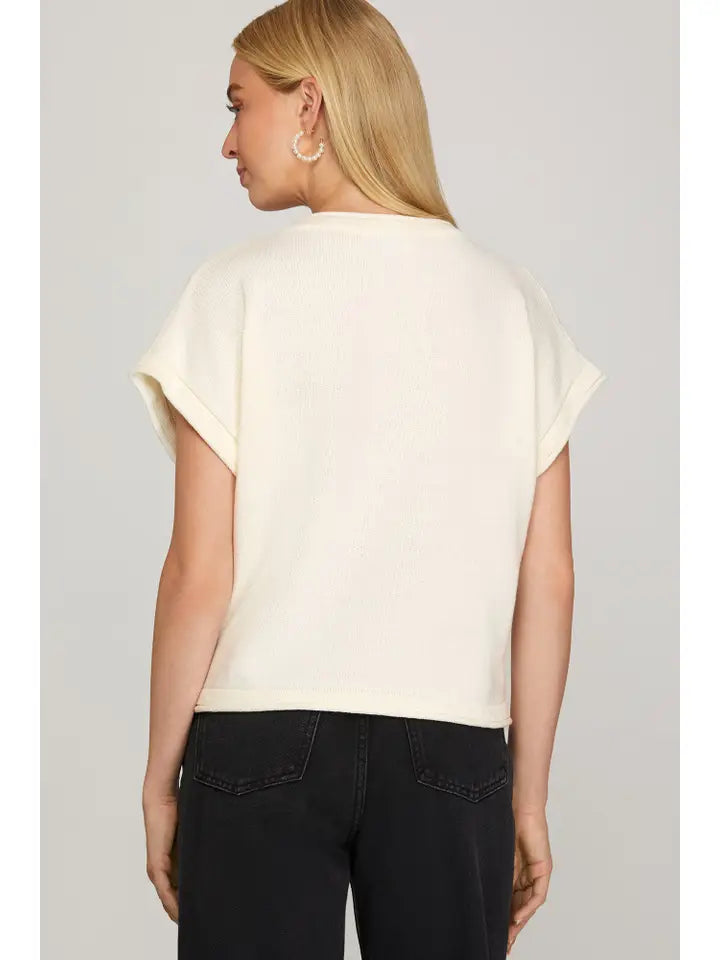 Drop Shoulder Puppy Knit Sweater Top Cozy knit sweater featuring an adorable puppy design with a relaxed drop-shoulder silhouette. Perfect for casual layering, this short-sleeve top brings playful charm to your everyday wardrobe. Soft, breathable fabric keeps you comfortable all day long.