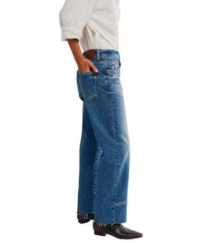 Features: Zip fly and button closure, five-pocket design, ankle-length inseam with frayed hem, utility seaming throughout