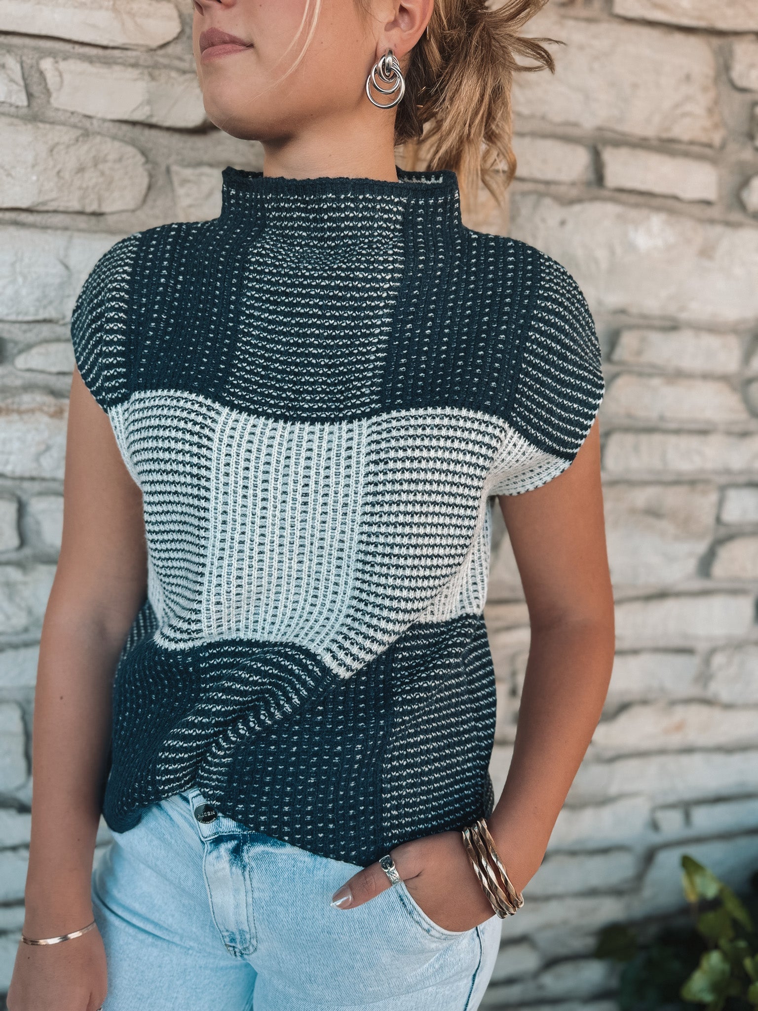 Layer effortlessly with this striking colorblock knit sweater vest, featuring a modern navy and grey design that transitions seamlessly from season to season. The cap sleeve silhouette offers a flattering, contemporary cut while the soft knit fabric provides all-day comfort. Perfect for pairing over your favorite tees or worn solo, this versatile piece elevates any casual wardrobe with understated sophistication and timeless style.