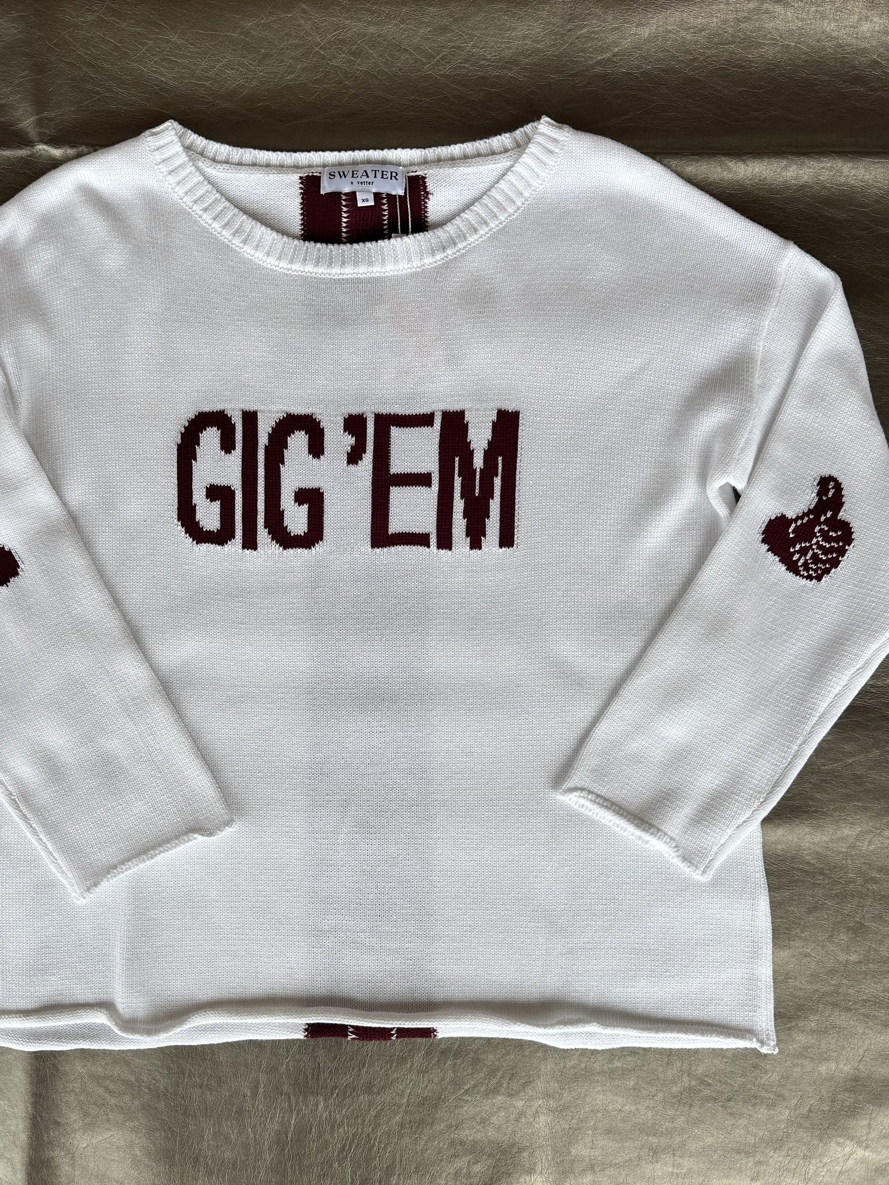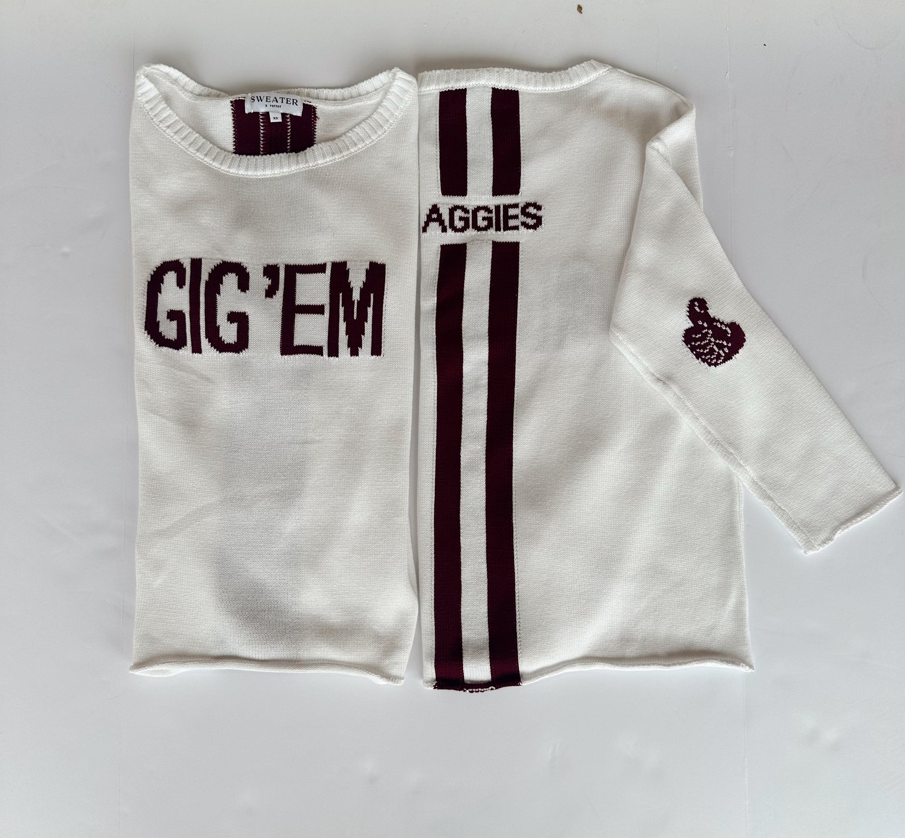 Show your Aggie pride with this classic game day sweater featuring the iconic "Gig 'Em" thumbs-up design. Perfect for cheering on Texas A&M at the stadium or around campus, this comfortable sweater combines school spirit with everyday wearability. Ideal for tailgates, watch parties, and showing your maroon and white loyalty year-round.
