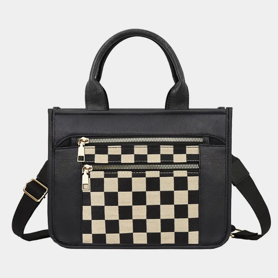A sleek black leather crossbody purse featuring stylish checkered accents for a trendy, hands-free look that suits everyday use.