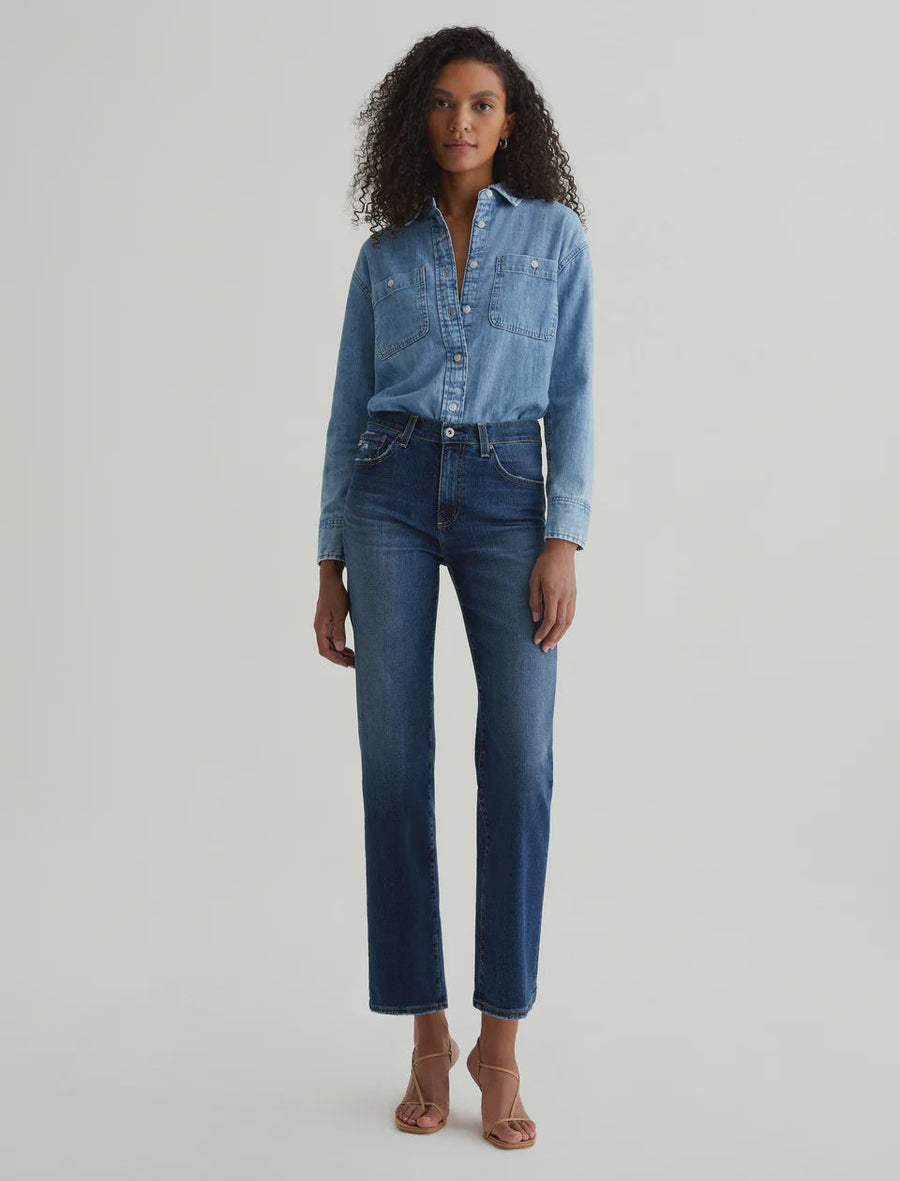 The Brinley Crop features a mid-rise waist and a straight-leg silhouette with frayed, ankle-baring hems. Designed in Vintage Comfort Stretch Denim from Italy, these cropped jeans for women have a dark indigo AG-ed™ wash with faded details, worn edges, and a bit of distressing at the pockets.
