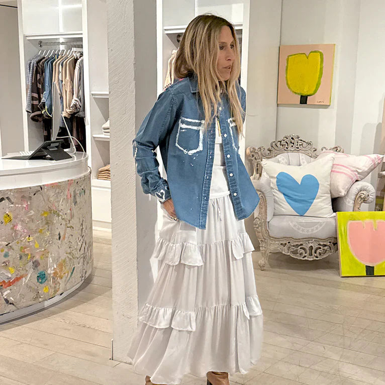 The Pia Western Studio Shirt is classic staple with a nod to Western shirting. Featuring Kerri's hand-painted artwork, as if she wore it to paint in her studio, snap-front closure and pockets, this medium indigo wash is crafted from the softest denim for a modern heritage-inspired look.  Wear it open over a tank or buttoned-up for a chic take on classic denim. Kerri Loves to layer it under our Workday Blazer.