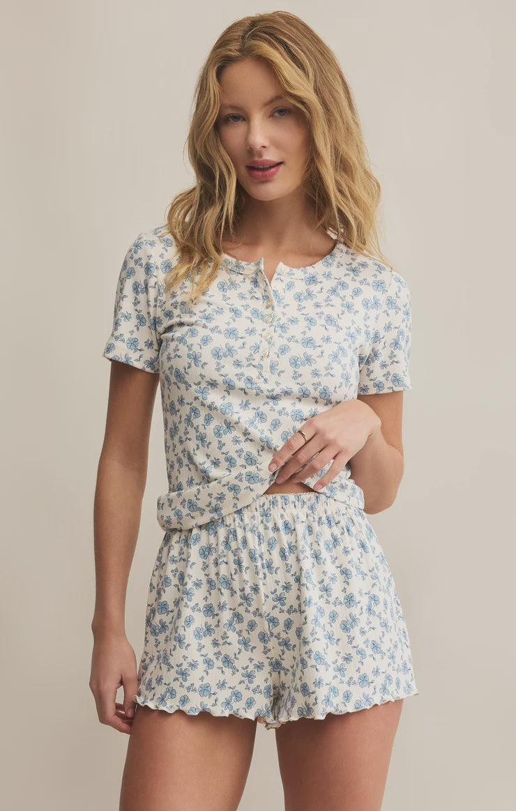Soft and stretchy with a hint of texture, this fitted henley is all about easy comfort. Made from silky pointelle fabric with a sweet ditsy floral print and delicate button details, it’s the kind of short sleeve top that moves from lounging to layering without missing a beat. Pair with the matching pants!