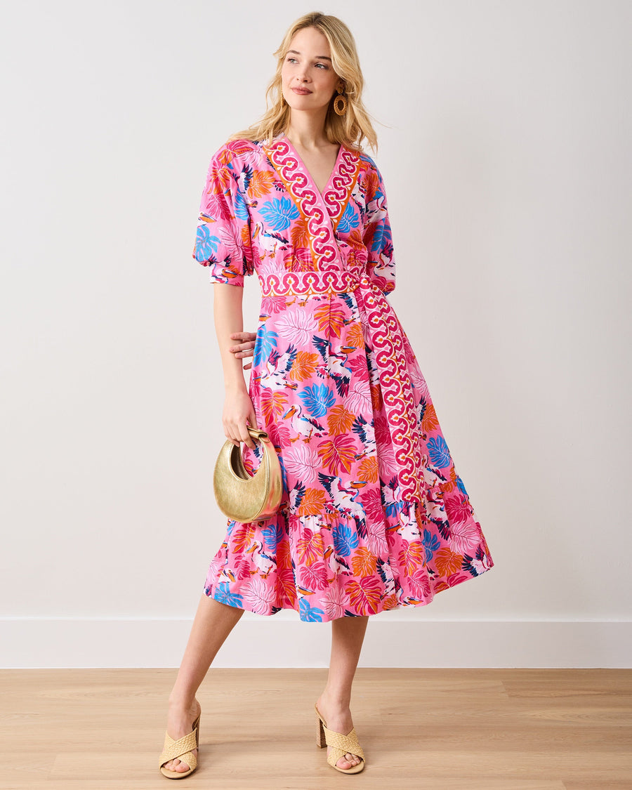 Elevate your wardrobe with the stunning GABRIELA DRESS IN PELICAN PALMS. This eye-catching midi dress features a vibrant multi-colored pelican pattern that's sure to turn heads. Crafted from 100% organic cotton cambric, it combines style with sustainability. The practical wrap design with elastic back ensures a comfortable, flattering fit for all body types. Fully lined for quality and comfort, this dress includes the ultimate fashion essential – pockets! Perfect for both casual outings and dressed-up occasions.