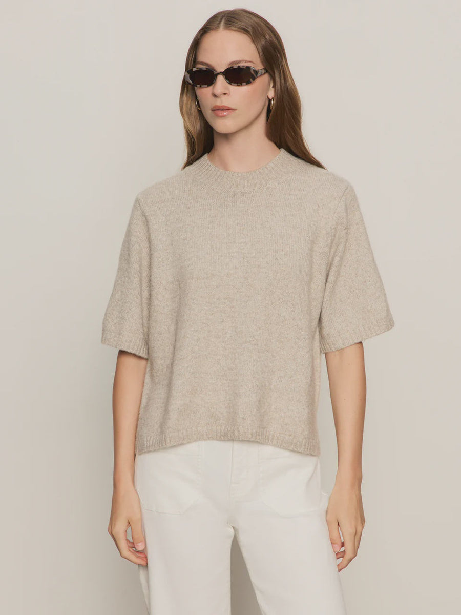 This relaxed-fit sweater tee features a classic crew neck and short sleeves, finished with ribbed detailing at the hem, neckline, and cuffs for a polished look. Comfortable and versatile, it’s perfect for everyday wear.