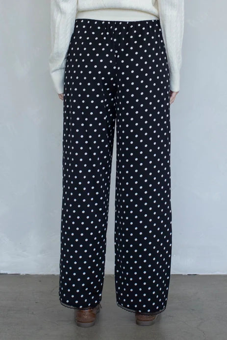 The cutest polka dot satin pants with an elastic waistband.