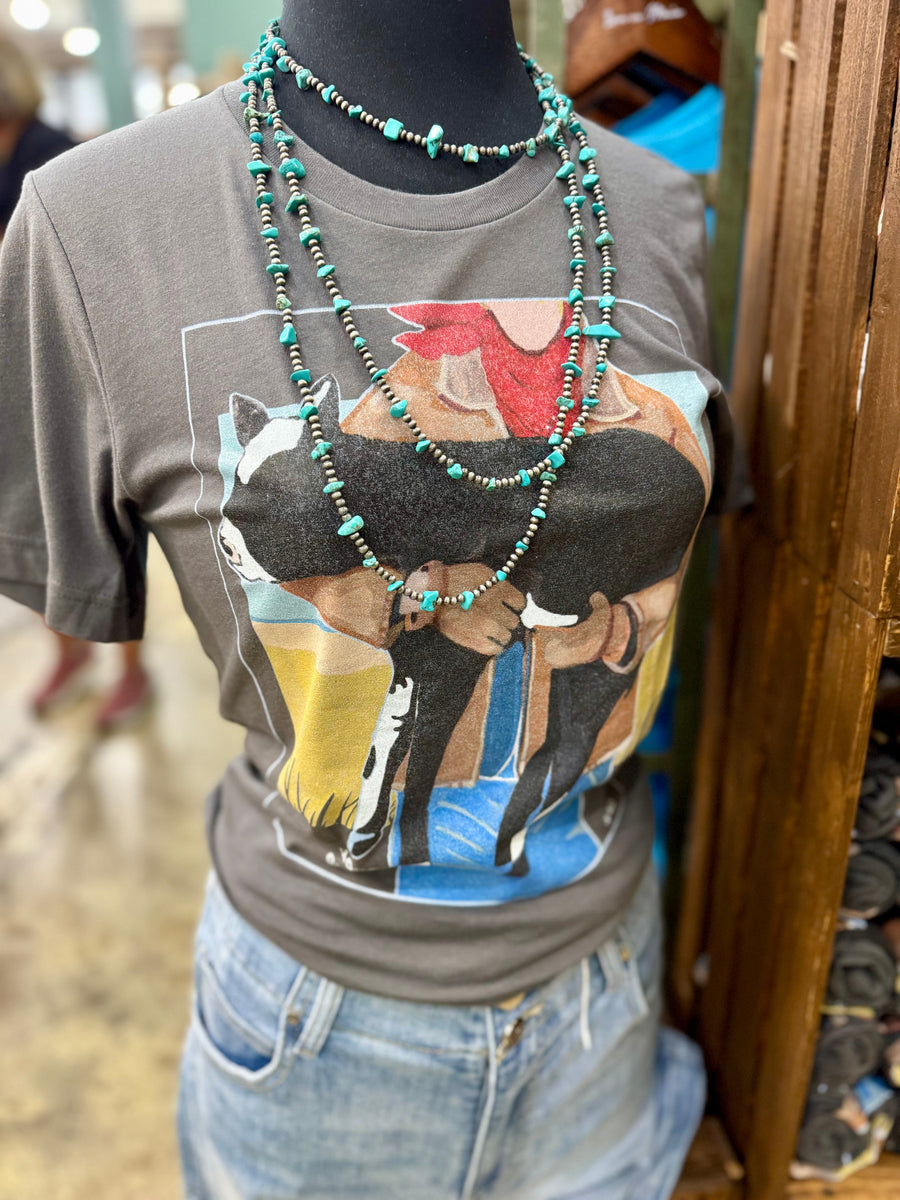Saddle up for style with our Precious Cargo Tee! This playful shirt features a charming design of a rancher carrying a calf, perfect for animal lovers and farm enthusiasts alike. Soft, comfortable, and guaranteed to spark conversations about your love for ranch life. Giddy up and add this to your collection!