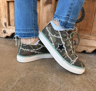 These super cute camo tennis shoes features a black star and frayed stitching.
